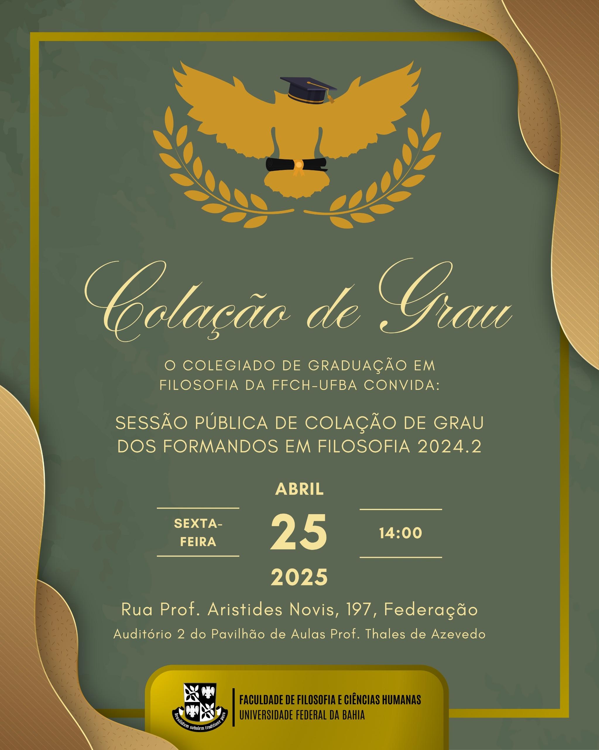 Dia 25 de abril irá ocorrer a Sessão Pública de Colação de Grau dos novos Bacharéis e Licenciados em Filosofia 2024.2!